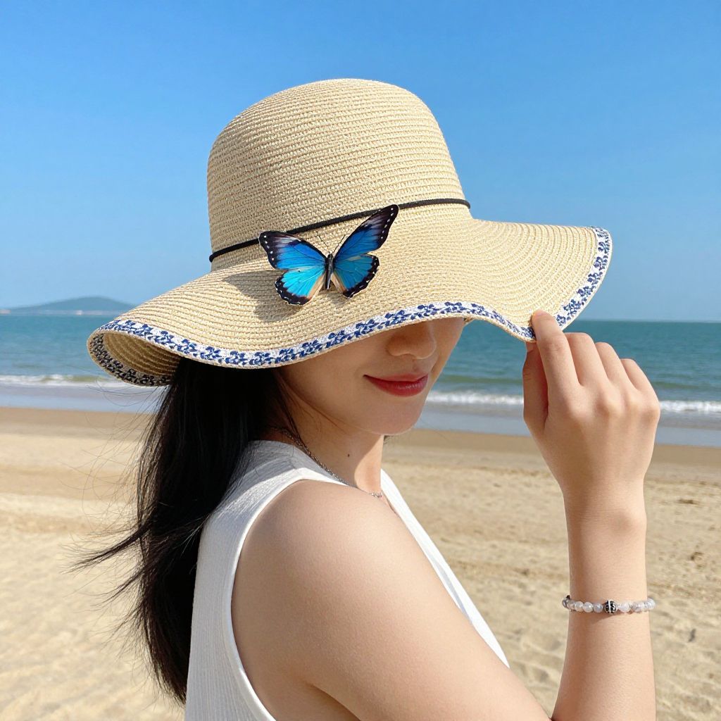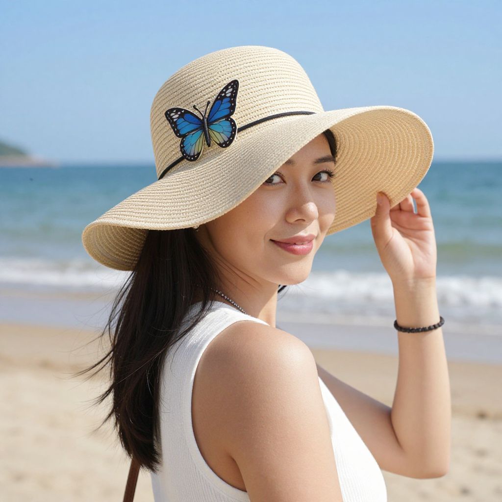 Woman enjoying a sunny day at the beach wearing a stylish wide-brimmed straw hat adorned with a butterfly emblem, complemented by a white sleeveless top and a bracelet, while her hand gently touches the brim as she smiles towards the camera.