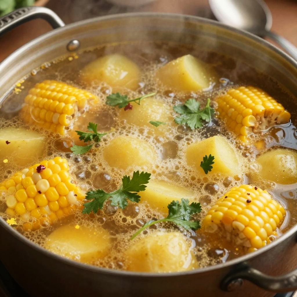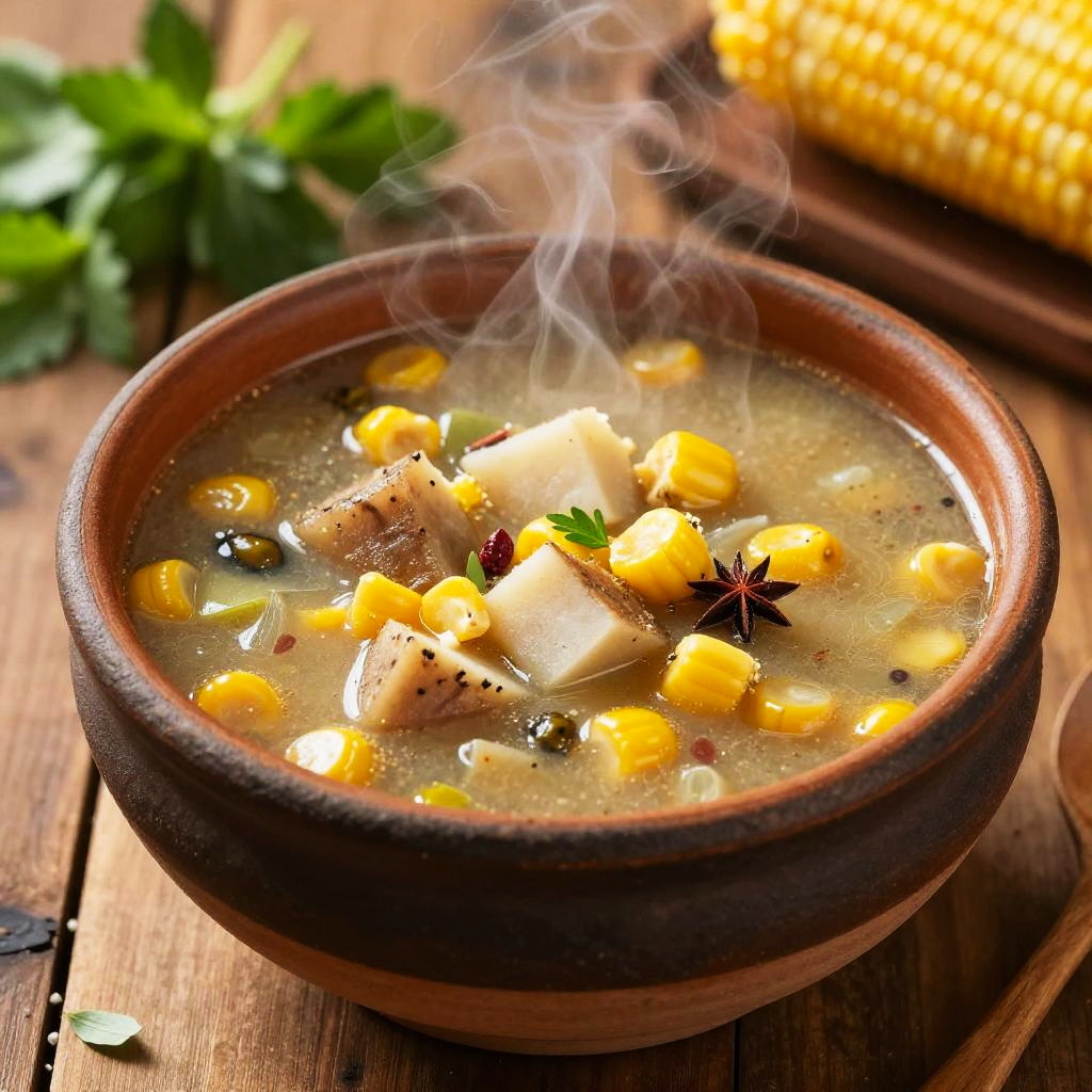 Venezuelan soup steaming in a rustic ceramic bowl, vibrant colors of corn, yucca, and spices, surrounded by fresh herbs on a wooden table, warm and hearty ambiance, photorealistic