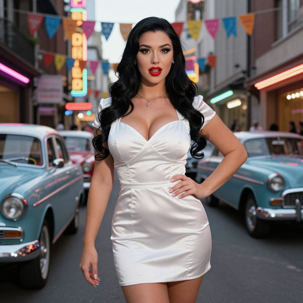 A vibrant woman with long black hair and a bright red lipstick wearing a short white silk dress as part of a cosplay costume for a 1950s retro-themed street fair, standing in a neon-lit city alley with vintage cars and colorful banners in the background, posing confidently with one hand on her hip. The woman has big tits and cute face