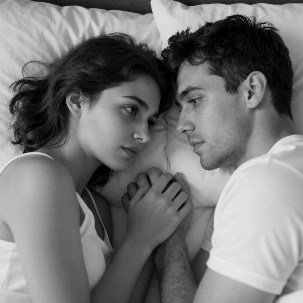 Photograph of a dimly lit scene with a woman with curly brown hair leaning over a man with blond hair, illuminated by a bright light source. The woman's face is close to the man's, who is lying down wearing a white shirt. The background is dark, emphasizing the intense light on their faces.
