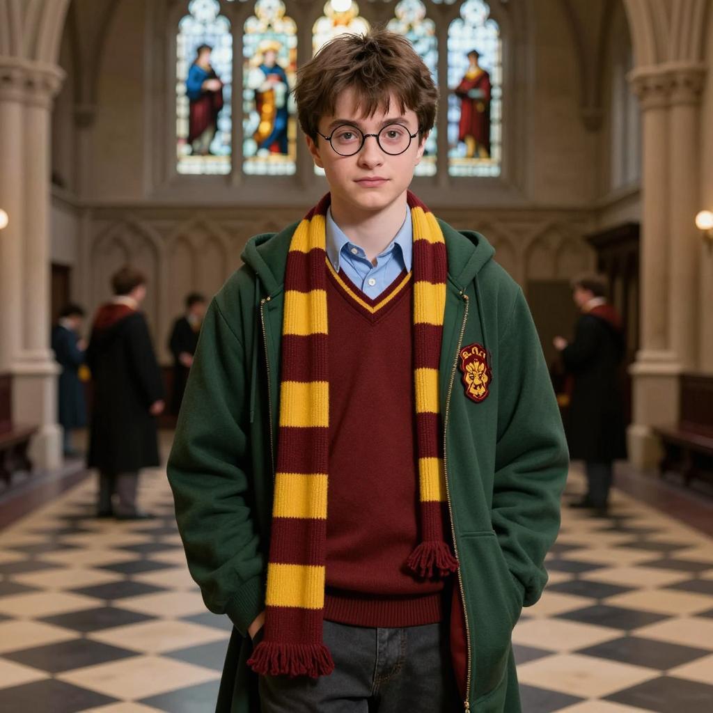 Quick harry potter costume, photorealistic, Hogwarts student, front view, standing in a grand hall, checkered floor, gothic architecture, stained glass window background, young boy, brown hair, glasses, serious expression, wearing maroon sweater, dark green hoodie with red and yellow striped scarf, light blue button-up shirt, dark pants, hands in pockets, blurred figures in background, subtle lighting, warm tones, detailed ures, realistic CGI, Harry Potter style, adaptive clothing, casual, academic setting, fantasy, young adult, Hogwarts uniform