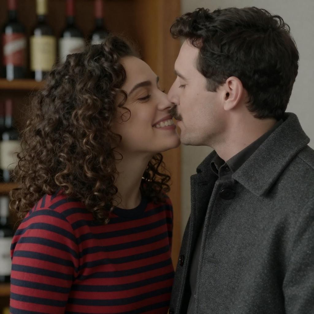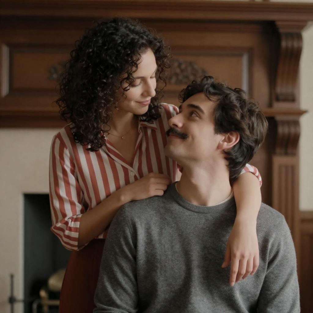 Photograph of a smiling woman with curly brown hair and fair skin, wearing a red and black striped shirt, being affectionately nuzzled by a man with dark hair, a mustache, and fair skin, dressed in a gray wool coat. Background includes blurred bottles on a shelf.