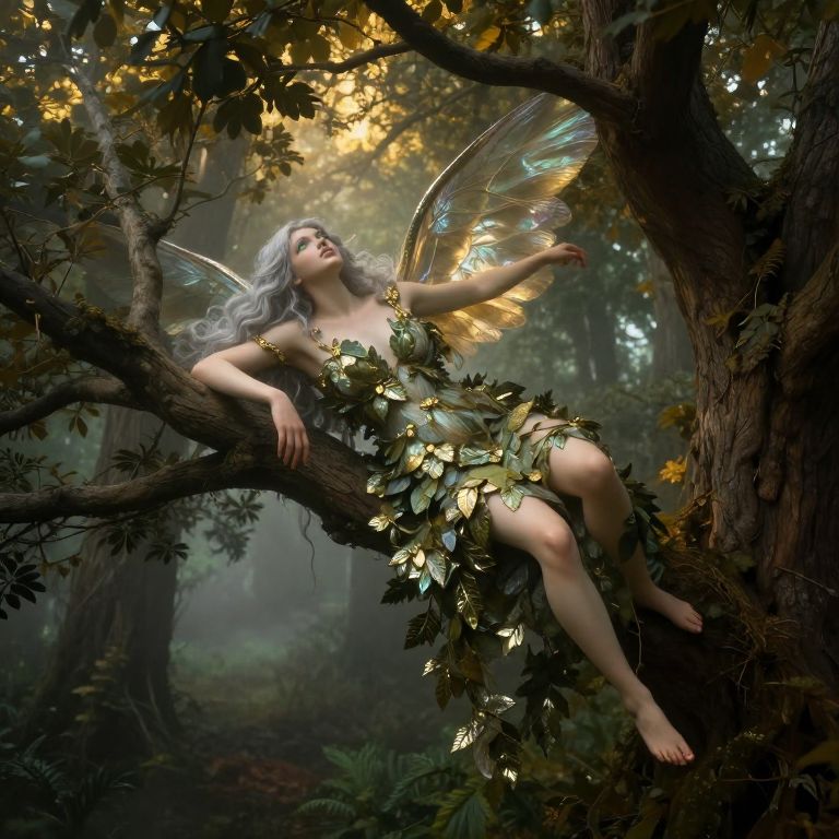 Craft an image in the manner of Renaissance art depicting an alluring female figure with flowing silver tresses and emerald eyes from an overhead viewpoint, nestled amidst the limbs of an ancient, mystical tree. She gracefully rests upon a slender branch above a foggy forest floor, her ethereal form draped in a gown composed of shimmering leaves, as if woven by nature itself. The soft golden light filtering through the dense foliage bathes her translucent wings in a mesmerizing iridescence, creating an enchanting scene that blurs the lines between reality and fantasy, evoking a sense of wonder and enchantment within the viewer.