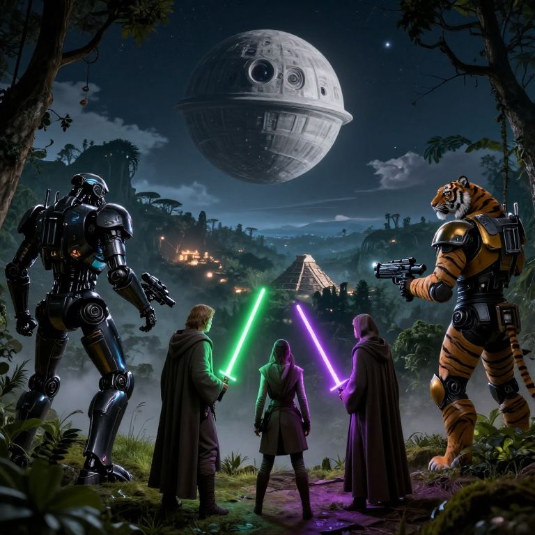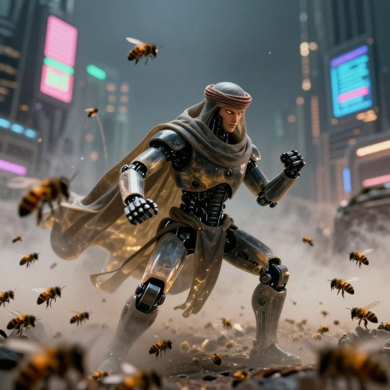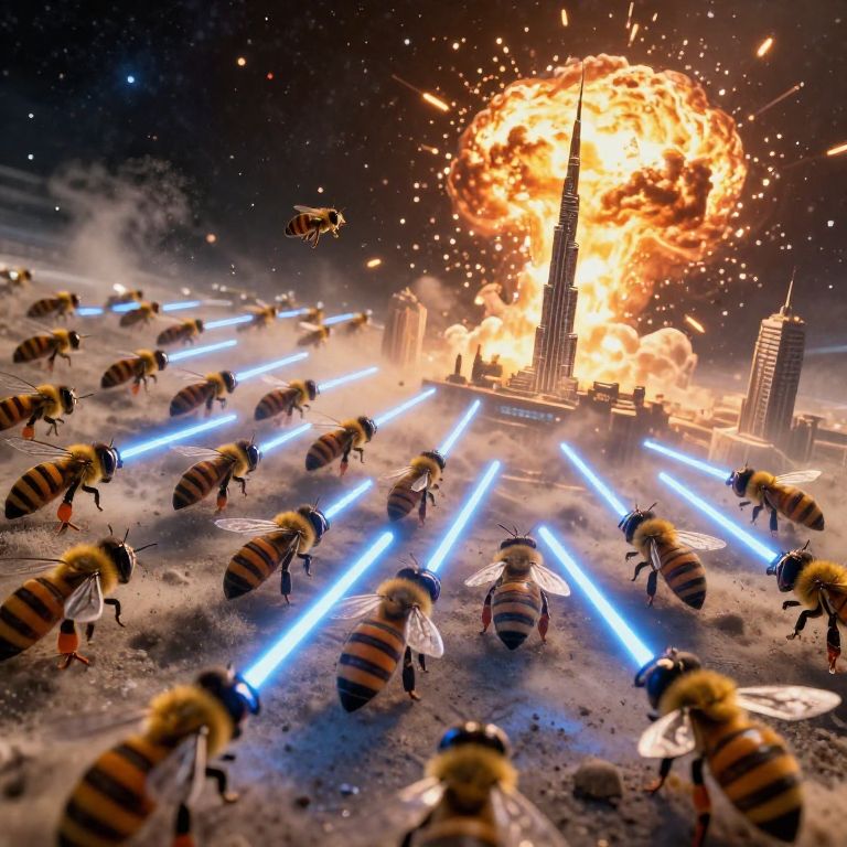 Microgeometry a closeup of a swarm of bees each of them carrying a light saber in the style of tron, fighting dust particles in space, atmospheric, with the burj khalifa in the background exploding,