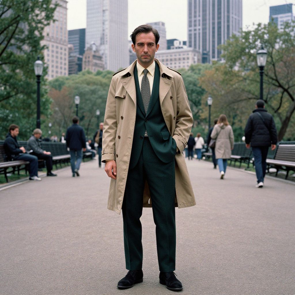 A man, dark green suit, ivory dress shirt, textured gray tie, modern khaki trench coat, black suede derby shoes, urban park, tree-lined trails, bustling city skyline, 3M ferrania analog film stock, confident expression. Man has masculine face and piercing eyes