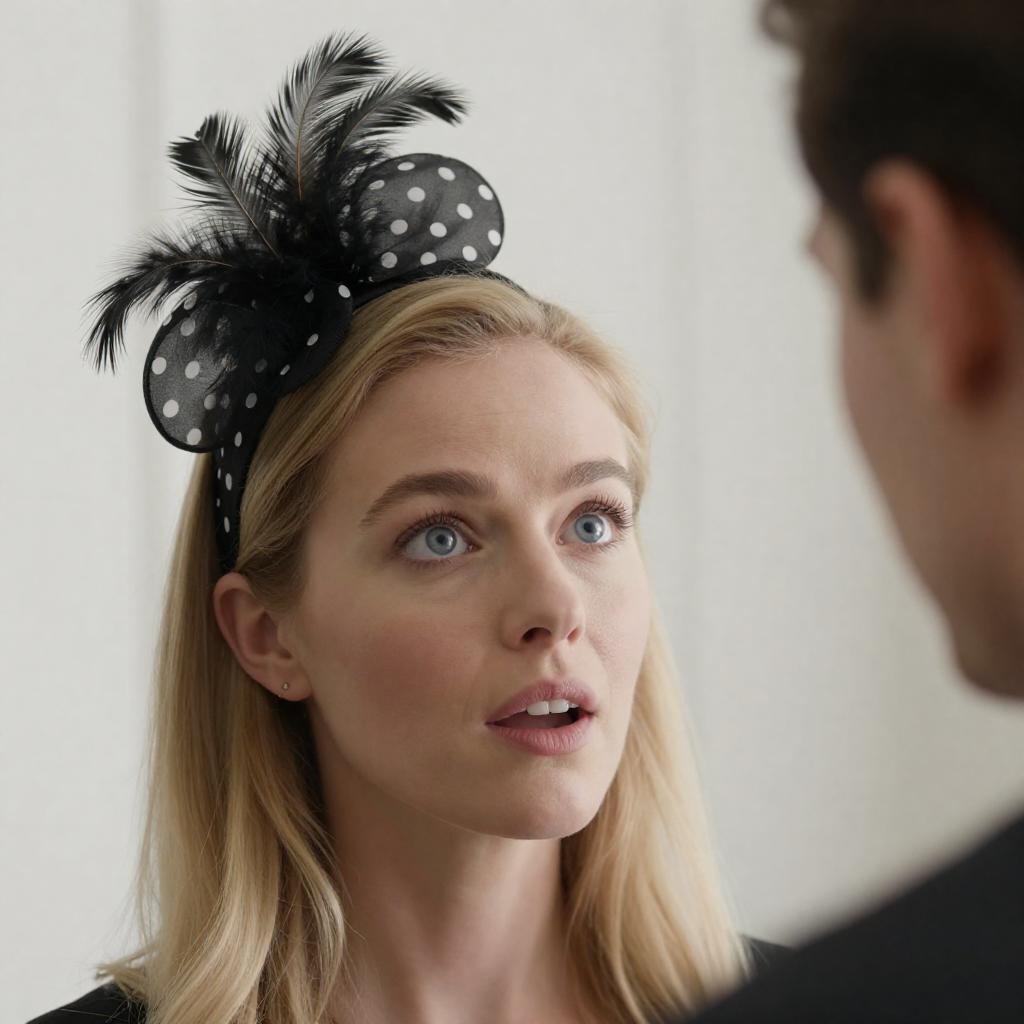 Photograph of a blonde woman with fair skin and blue eyes, wearing a black polka-dotted headband with a black feather, looking surprised with her mouth open. She is partially visible from the shoulders up, with a man's profile in the background on the right. The background is a softly lit, white-paneled room.
