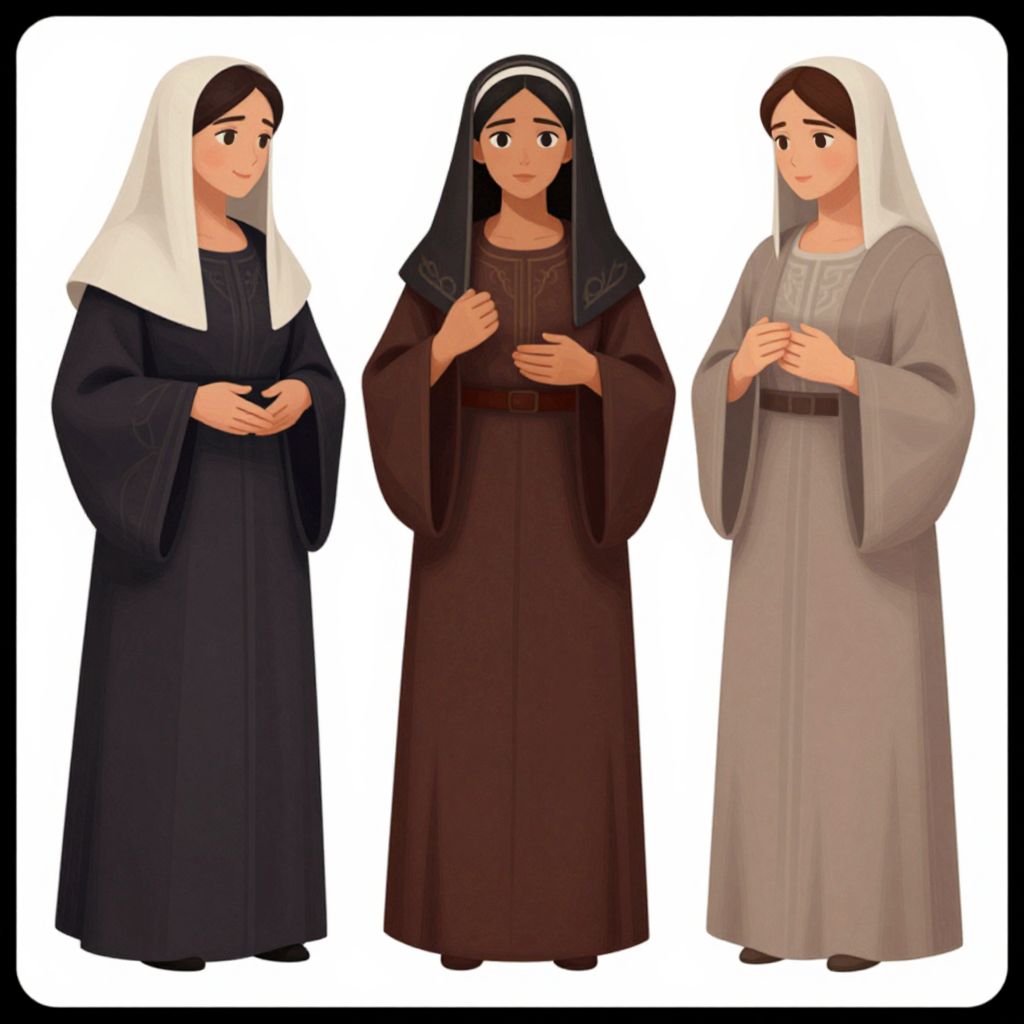 Illustration of three Jewish women from biblical times wearing traditional robes and head coverings. The women are dressed in modest long dresses with wide sleeves and belts, featuring headscarves in shades of white, brown, and black. The style is a clean, animated artwork depicting historical attire and cultural representation from biblical era Judaism.