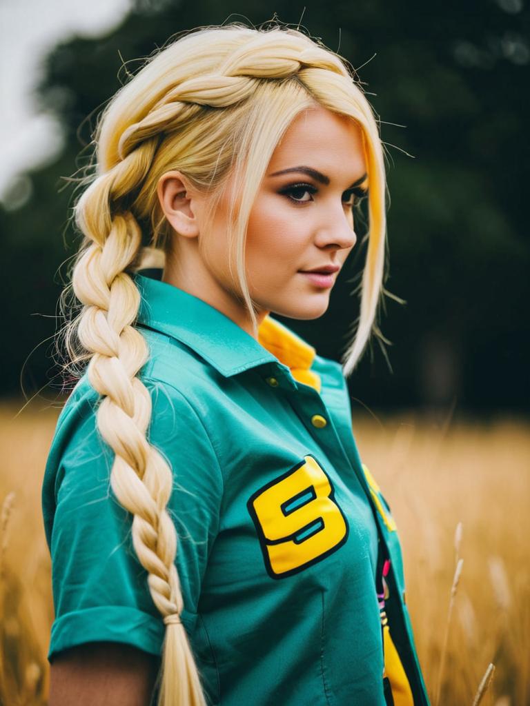Photo-realistic cosplay photo of person in agent 3 (splatoon 3) costume. 1girl, pointy ears, yellow eyes, eyebrow cut, tentacle hair, blonde hair, long hair, asymmetrical hair, single braid, side braid, torn shirtlifestyle stock photo, shallow depth of field, lifestyle stock photography, shallow depth of field, natural lighting, warm tones, soft background blur, candid moments, vibrant colors, realistic textures, modern casual clothing. full body shot