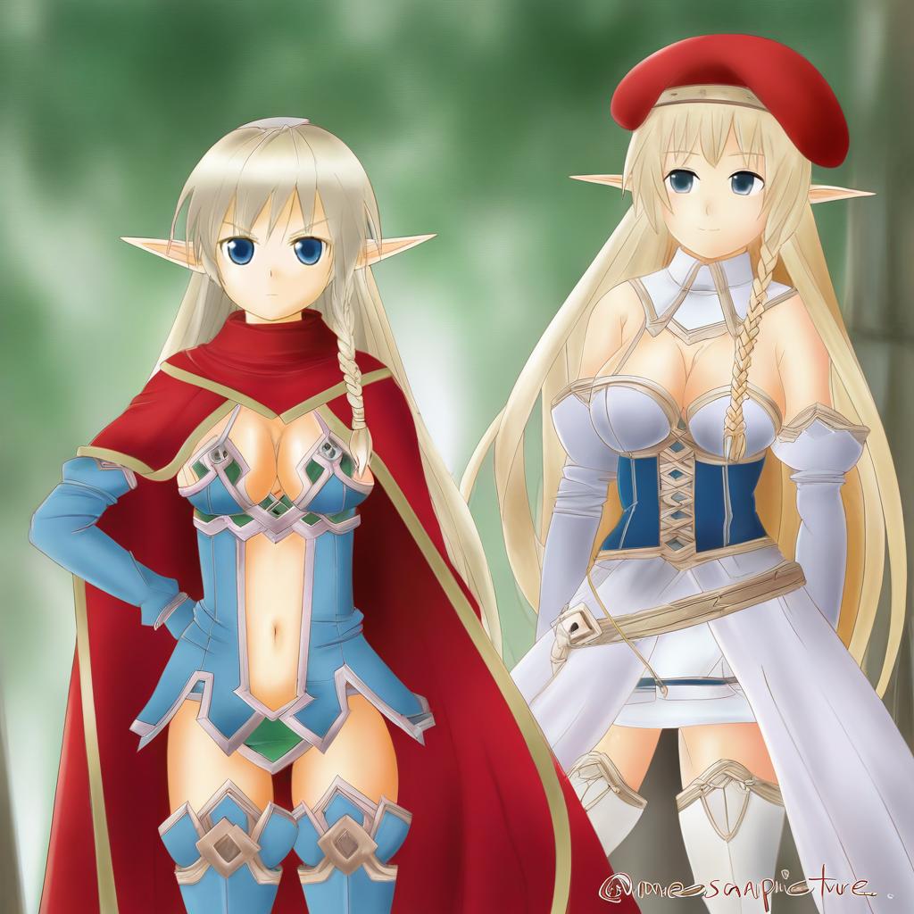Alleyne (queen's blade), queen's blade, 1girl, blue eyes, long hair, blonde hair, side braid, large breasts, medium breasts, cleavage, elbow gloves, thighhighs, cape, elf, beret, midriff, by artist pokimari, leet