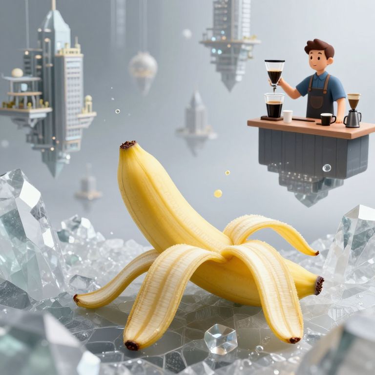 Digital illustration of a floating barista serving coffee above a large, peeled banana on a crystalline cityscape background.