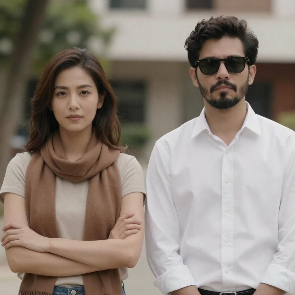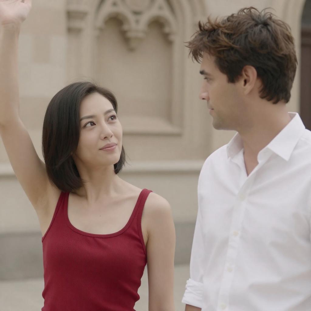 Photograph of a man and woman standing outdoors. The woman, with short black hair and a red tank top, raises her right arm. The man, with shaggy brown hair and a white shirt, looks at her. An ornate stone building is in the blurred background.