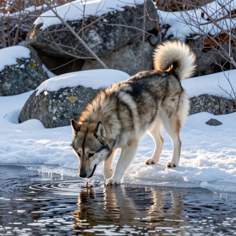 Photograph of a Siberian Husky with a thick, brown, black, and white fur coat, standing in a snow-covered area. The dog is drinking from a partially frozen stream, creating ripples in the water. Its bushy tail is curled upwards. The background includes large, snow-covered rocks and leafless branches. Bright sunlight illuminates the scene, casting reflections on the water and highlighting the Husky's fur. The texture of the snow contrasts with the dog's sleek fur and the smooth water surface.