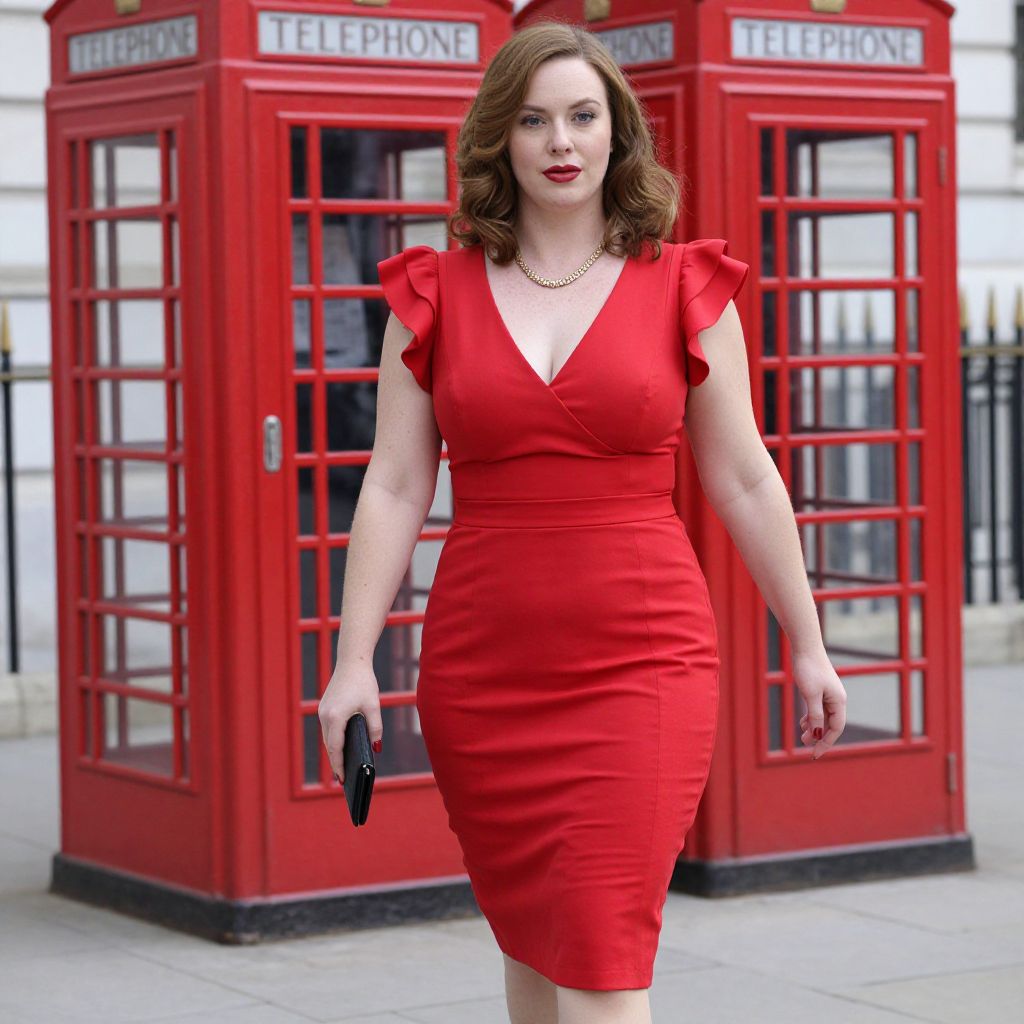 Photograph of a confident, curvy woman with fair skin and wavy brown hair, wearing a tight, red V-neck dress with ruffled shoulders and a gold necklace. She's walking in front of three classic red British phone booths. Her red lipstick matches her dress, and she's holding a black clutch in her right hand. The background includes a gray pavement and a black iron fence.