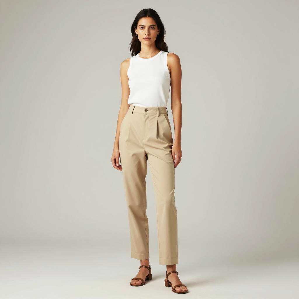 Middle-aged woman, Lean Build, Medium Length Wavy Hair, kelsey plum outfit, cotton t-shirt, open flannel shirt, chinos, loafers, laid-back casual