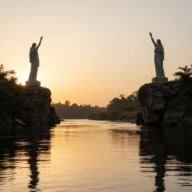 Serenity whispers through the still waters of a tranquil river, its surface mirroring the golden embrace of dawn as two statues stand sentinel atop rocky cliffs, their raised arms reaching toward the heavens, symbolizing hope and the eternal quest for connection amidst the vast, silent expanse.