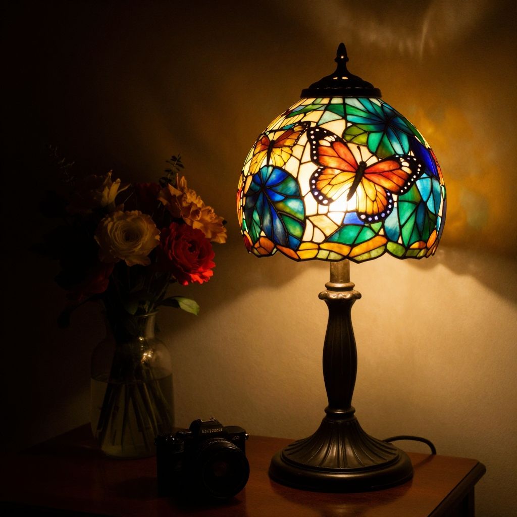 8k, (best quality:1.3), (masterpiece:1.3), (detailed:1.2), uhd, distinct image, (midriff), ((photogenic, rule of thirds)), raw photo, (semirealistic art style:1.2), a brightly colored lamp on a table next to a vase of flowers, digital art inspired by louis comfort tiffany, featured on pixabay, art nouveau, butterfly lighting, beautiful lit lamps, lamps, natural volumetric lights, sharp focus, sony a7 iv and 50mm sigma f/1.4 zeiss lens, the photograph is expertly captured by renowned photographer justin hogan, film grain and rich, deep colors, shadows