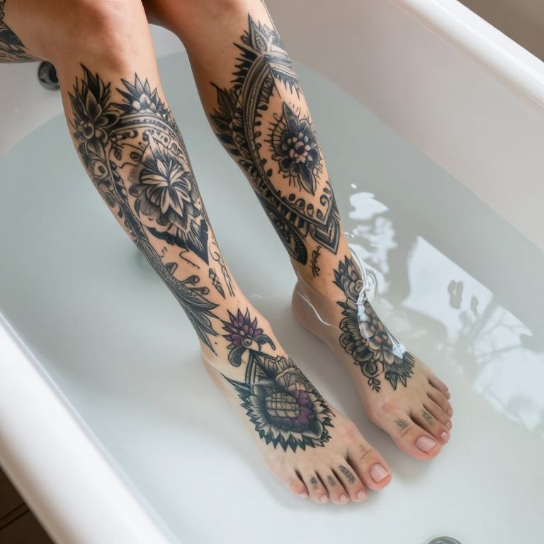 Photograph of intricately tattooed legs with black floral designs in a white bathtub filled with clear water, showing pink-painted toenails.