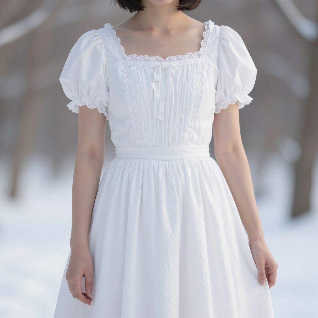 Photograph of a young woman from the shoulders to the waist, wearing a white, short-sleeved, square-neck dress with delicate lace trim on the neckline and sleeves. The dress has a gathered bodice and a flowing, slightly A-line skirt. The background is blurred, showing a snowy outdoor setting with bare trees. The woman's skin is light, and her dark brown hair is cut short. The image has a soft, slightly overexposed look, emphasizing the purity and simplicity of the white dress against the wintry background.