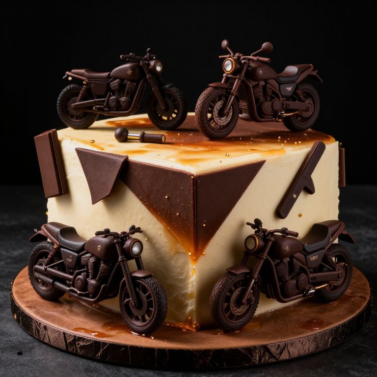 Manly cake designs showcasing strong geometric shapes, masculine themes like motorcycles and tools, decorated with dark chocolate and whiskey-infused frosting, dramatic lighting.