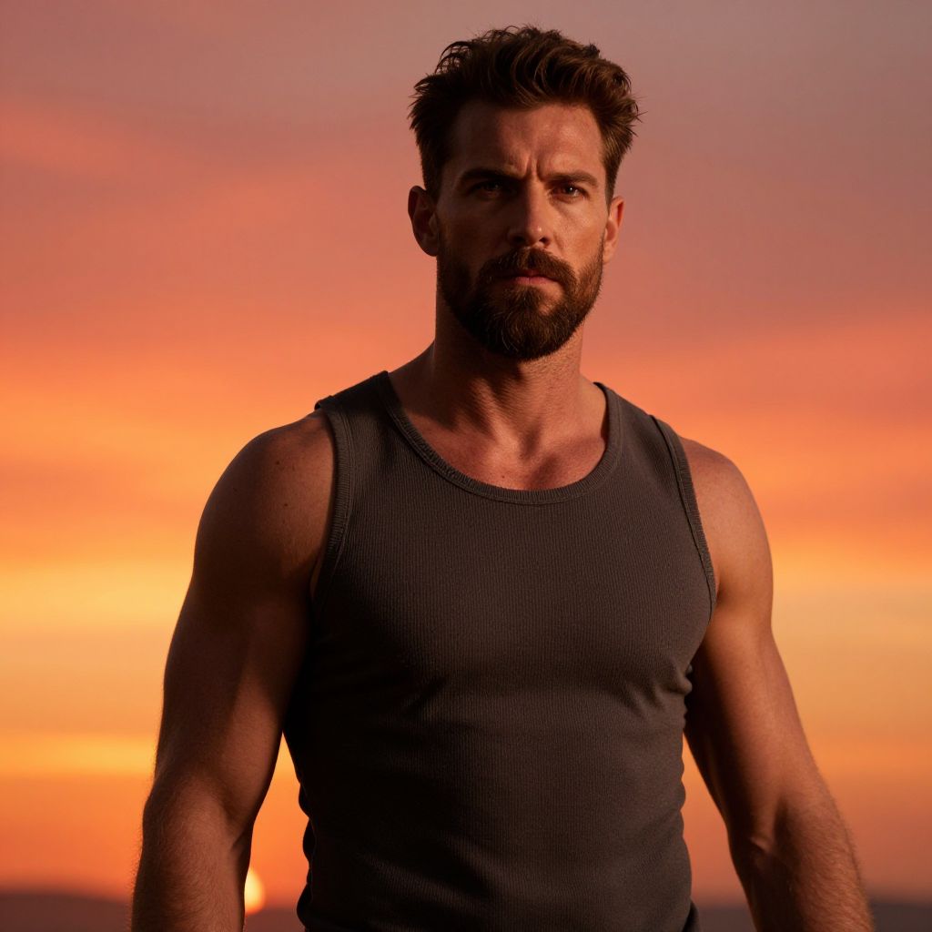 A man with a rugged appearance and a well-groomed beard stands confidently against the backdrop of a vibrant sunset. The image captures a cinematic style reminiscent of a dramatic film scene with warm, rich colors. His muscular physique is accentuated by a sleeveless top, embodying a sense of strength and masculinity.