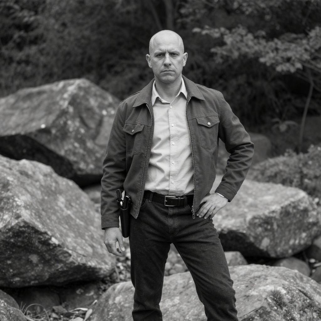 Photograph of a bald man with a beard wearing sunglasses, a grey jacket, black hoodie, and blue jeans, holding a rifle. He stands in a wooden and metal doorway, with bags and a black duffel bag on the ground. His left hand is in his pocket. Casual, serious expression. Natural light.