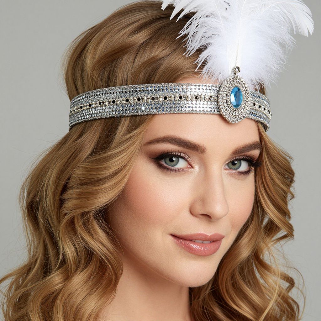 Photograph of a light-skinned woman with wavy, shoulder-length blonde hair. She wears a silver, rhinestone-encrusted headband adorned with a white feather on the left side. Her makeup includes dark, dramatic eyeliner and smoky eyeshadow, paired with nude lipstick. She has a slight, confident smile. The background is a plain, light gray, putting focus on her headband and facial features. She is wearing a sleeveless, light-colored top. The image has a vintage, glamorous style, reminiscent of 1920s flapper fashion.