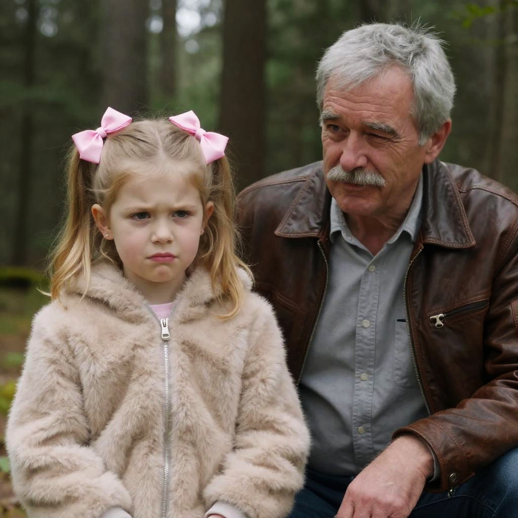 Photograph of an older man with gray hair and mustache, wearing a brown leather jacket over a gray shirt, and a young girl with blonde pigtails, pink bows, and a beige fur jacket. Both sit outdoors, forest background. Girl looks slightly annoyed, man winks. Forest trees in the background.