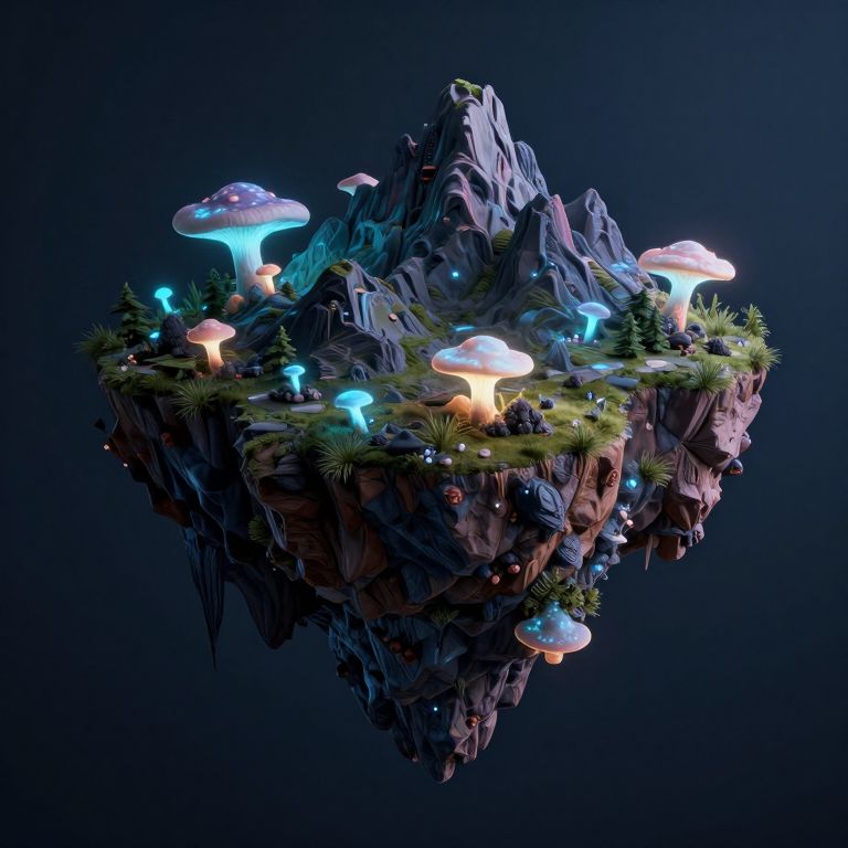 A surreal 3D-rendered landscape depicts an inverted mountain range growing downward into the earth, illuminated by ethereal bioluminescent fungi that resemble glowing clouds, creating a dreamlike, cyberpunk-inspired nocturnal scene with dramatic lighting and high-definition detail.