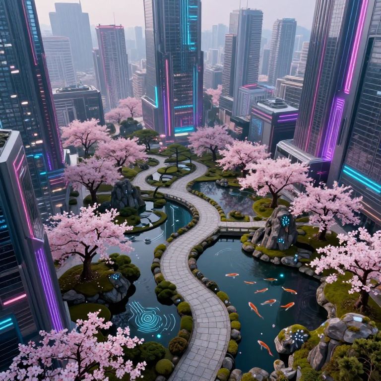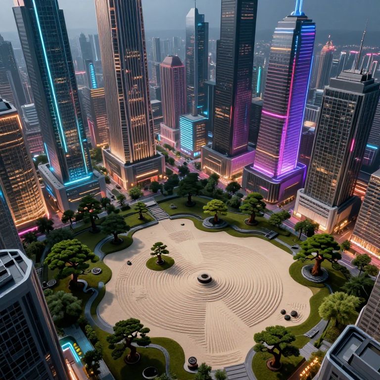 Imagine a surreal digital artwork depicting an extraordinary cityscape, characterized by towering skyscrapers and vibrant neon lights that create a stark contrast with a serene Zen garden below. From a bird's eye view, the scene seamlessly blends futuristic urban chaos with tranquil natural elements, showcasing intricate sand patterns and miniature bonsai trees in perfect harmony. This striking composition evokes feelings of wonder and contemplation as viewers delve into a unique fusion of technology and nature.