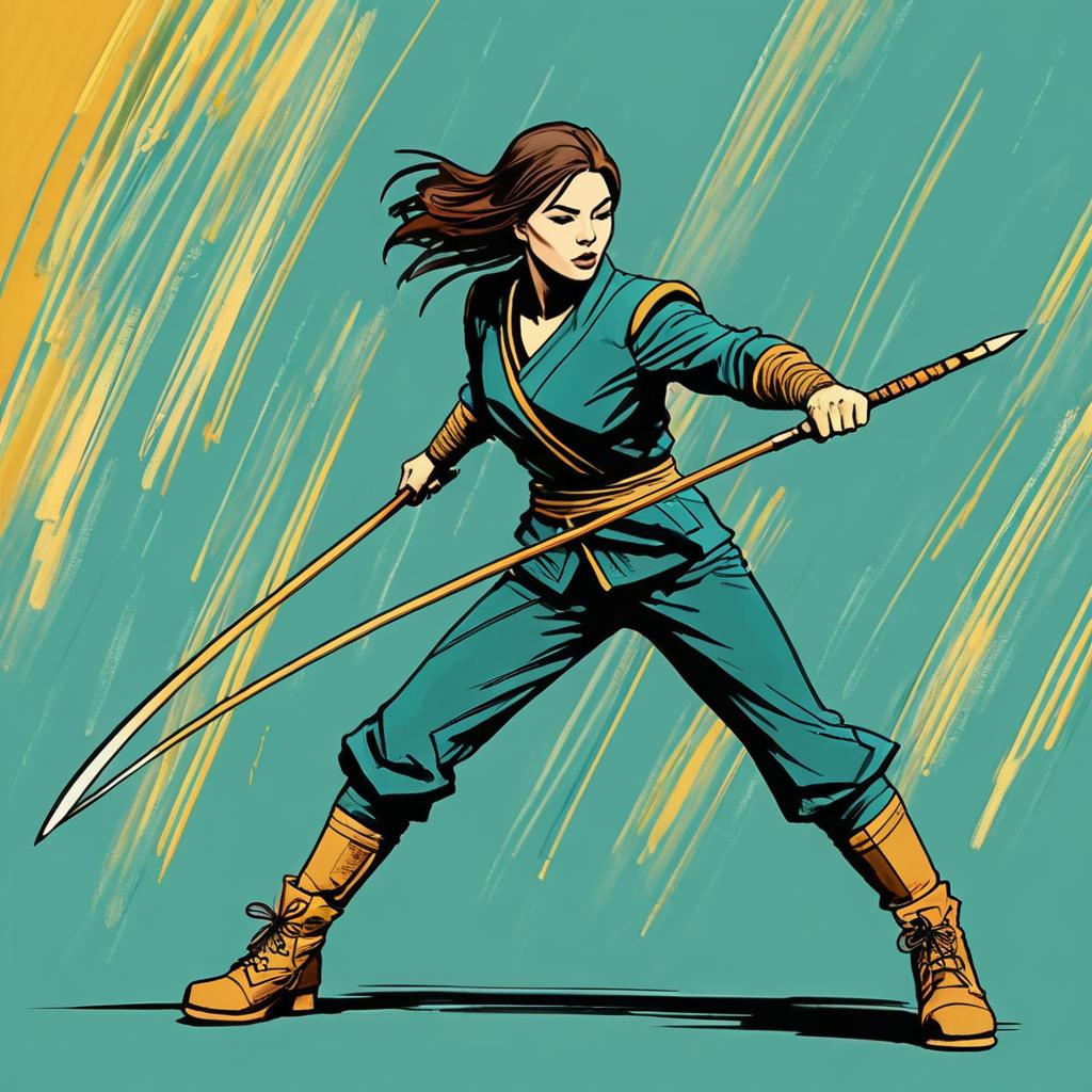 Illustration of a female ninja in a dynamic combat pose wielding two spears. She has medium-length brown hair and sharp features, dressed in a teal martial arts outfit with orange accents, including wrist wraps and boots. The background features abstract teal and yellow streaks, emphasizing movement. The style is a detailed comic or graphic novel illustration.