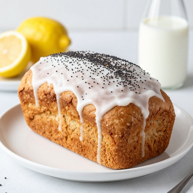 A loaf of poppyseed bread with icing sitting on a white plate with a lemon and vegan milk in the background.