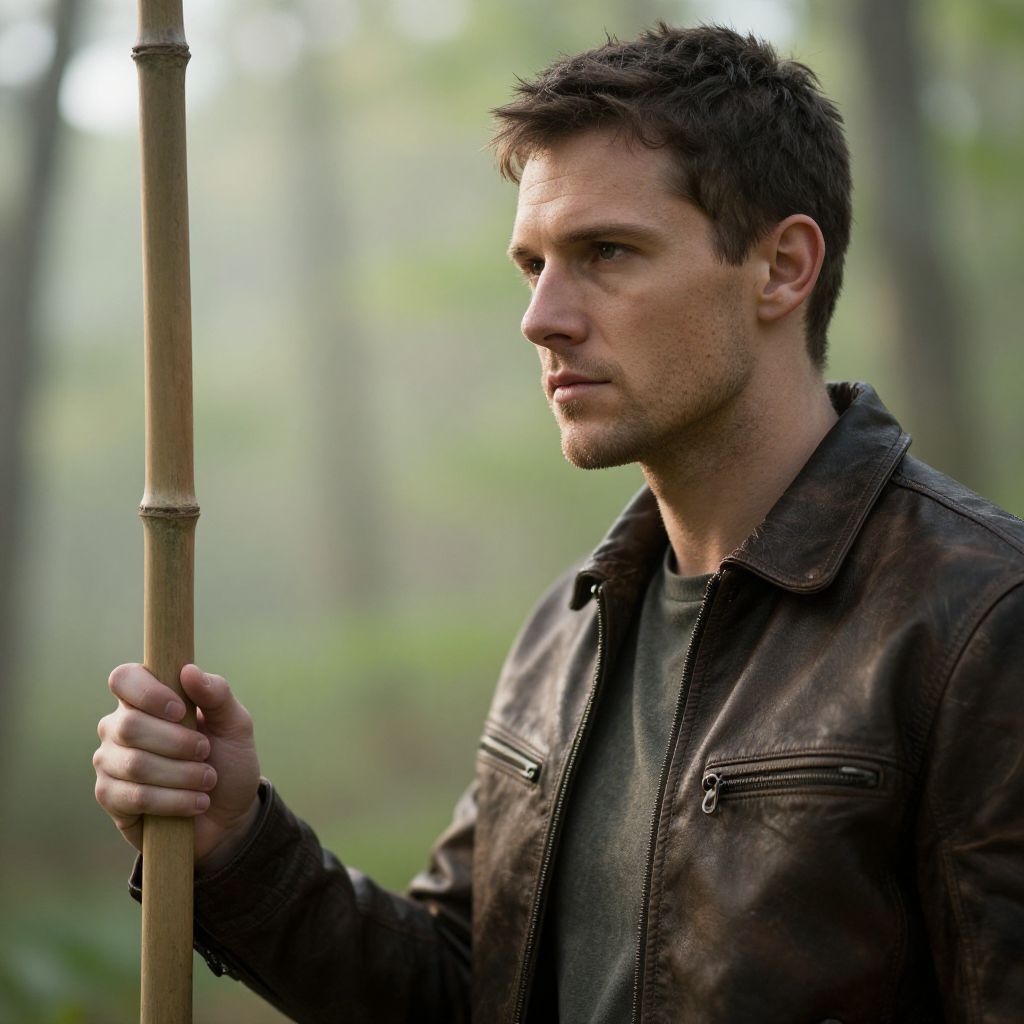 Close-up of a wiry build man in a forest clearing, holding a single bamboo pole, wearing a leather jacket, serene expression, soft natural morning light, environmental depth, nature-inspired realism, MidJourney style.
