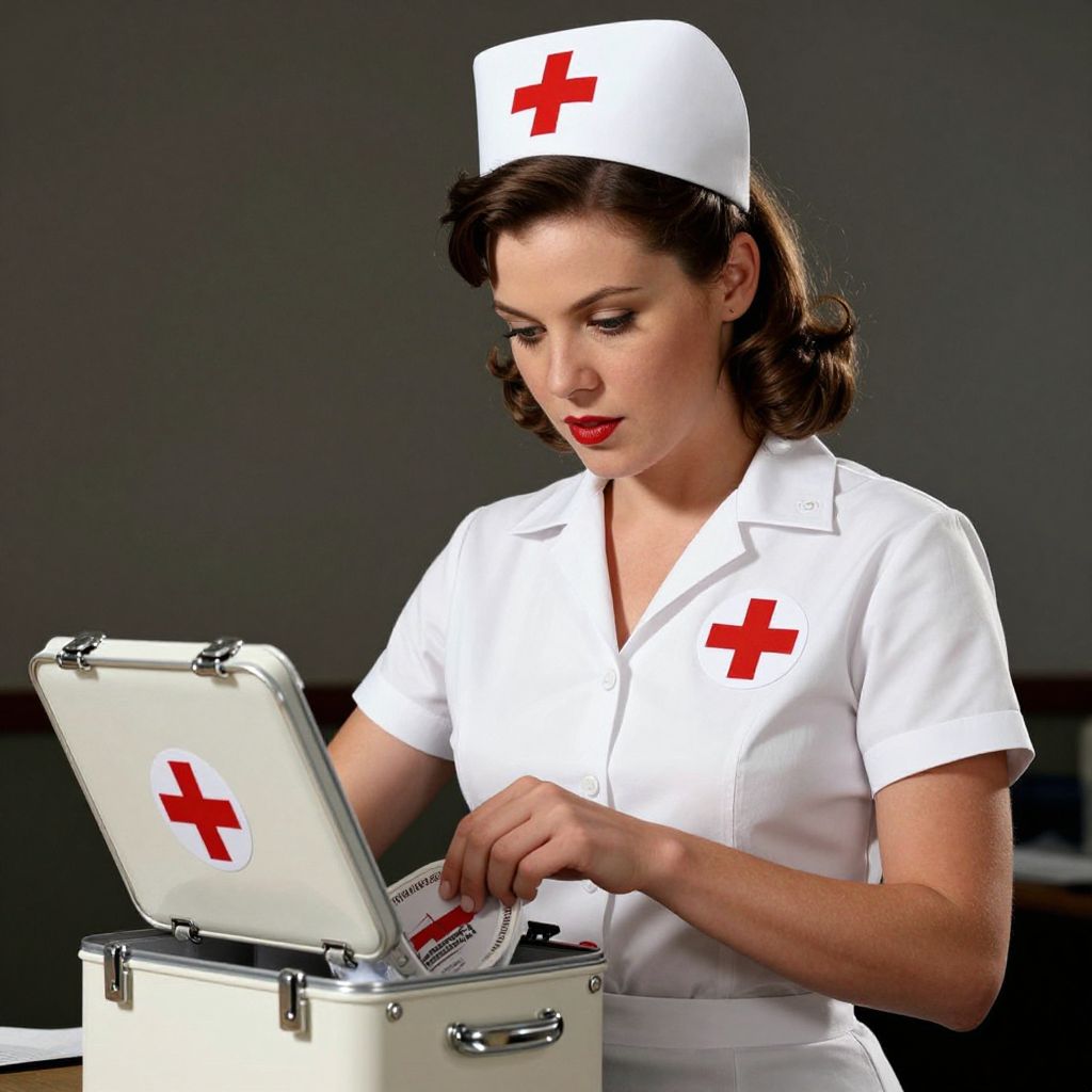 Photograph of a fair-skinned woman with dark, wavy 1940s-style hair, dressed in a white nurse's uniform with red cross emblems on her hat and chest. She is intently reading a paper while using a silver clipboard. Her red lipstick and classic makeup complement the vintage look. The background is blurred, focusing on the nurse, and features dim lighting, adding a dramatic effect. The nurse's uniform includes a short-sleeved, button-up shirt with a red belt. The image has a retro, pin-up style aesthetic.