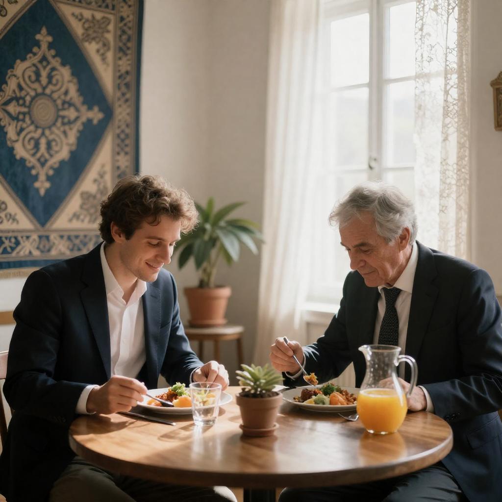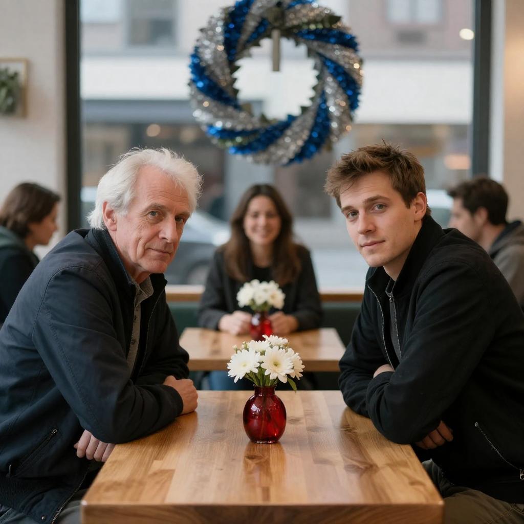 Two men sitting at a wooden table in a café, leaning towards each other. Older man with white hair in a dark jacket, younger man with brown hair in a black jacket. White flowers in red vases on the table. Woman in the background smiling. Large blue and silver wreath on the window. Soft lighting. Casual, serious expressions. Two other people in the background.
