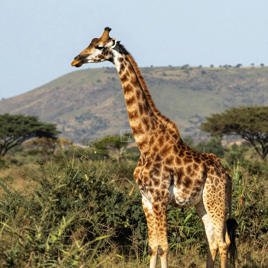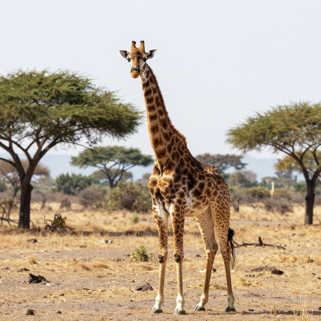 Photograph of a solitary giraffe standing in a vast, sunlit savanna. The giraffe, with its long neck and distinctive brown spots on a tan coat, is positioned slightly to the left of the center. The background features a clear, bright blue sky and an expansive, golden-yellow grassland that stretches to the horizon. Sparse acacia trees dot the distant landscape. The giraffe's head is turned slightly to the right, and its legs are spread apart, showcasing its tall, slender physique. The image has vivid colors and sharp contrasts, highlighting the natural beauty of the African wilderness.
