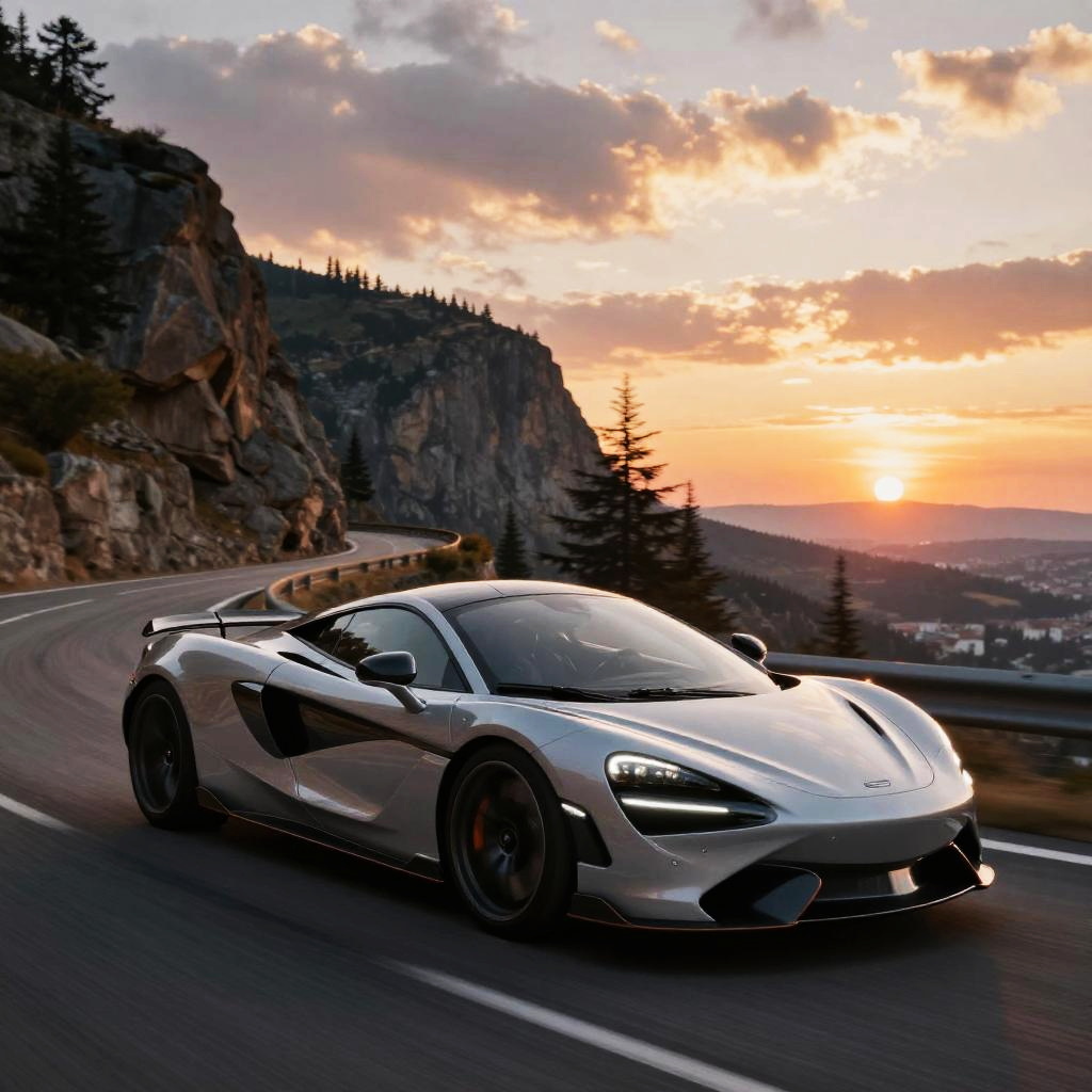 161 sleek modern sports car speeding on a winding mountain road, dynamic motion blur, vibrant sunset sky in the background, detailed vehicle design with metallic finish, dramatic cliffs and pine trees surrounding, high quality hyper-realistic image