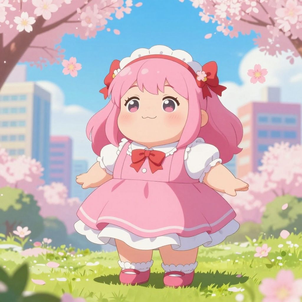 Chubby anime girl with pink hair wearing a cute dress, surrounded by floating cherry blossoms, bright and colorful scene, vibrant cityscape backdrop
