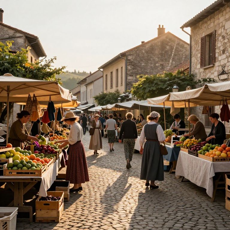 Gourgandine, a vintage street market in a European village at dawn, cobblestone streets lined with rustic stalls overflowing with fruits and fabrics, villagers in period clothing engaging energetically, warm golden morning light casting long shadows, capturing a vibrant slice of historical life.