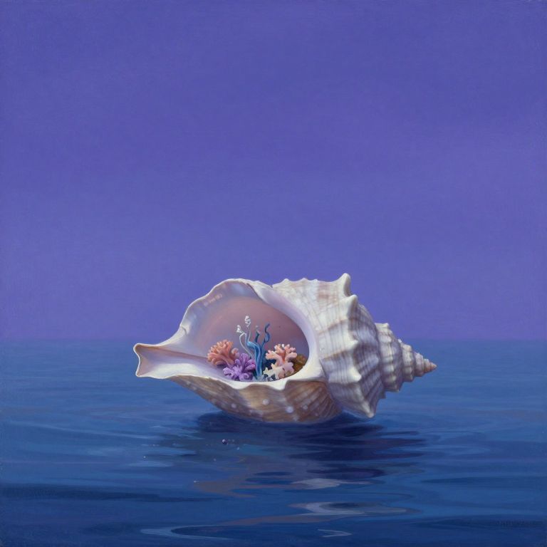 Craft an image reminiscent of surrealist painting techniques, depicting a serene coastal vista where the boundary between sea and sky appears to blur seamlessly. In this dreamlike setting, a colossal seashell hovers above the water's surface with an air of otherworldliness. The shell's interior is adorned with intricate formations resembling delicate marine life, such as soft corals and swaying seaweed, creating an enchanting contrast against the deep blues and purples that dominate the sky. Capture this tranquil seascape from a high vantage point, employing a soft focus to evoke serenity while suggesting an underlying enigma beneath the ocean's placid surface.