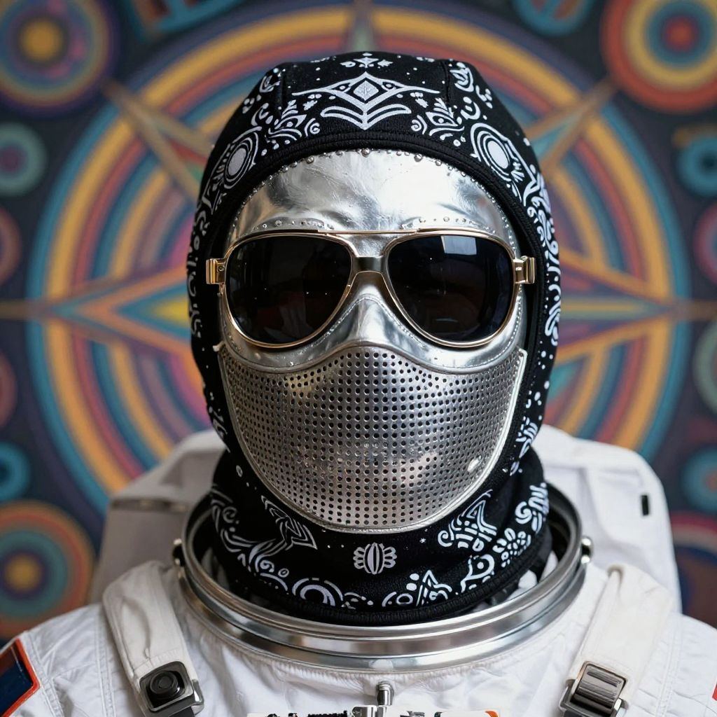 Close-up hyper-realistic image of a mysterious astronaut wearing a silver perforated mask, stylish sunglasses, and a black balaclava with intricate white patterns. The background features colorful, intricate circular designs inspired by surrealism and contemporary art styles, creating a visually striking and detailed composition.