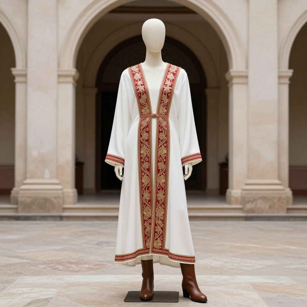 A mannequin wearing a white robe with intricate red and gold embroidery on the front, along with a pair of brown boots, standing in a courtyard with a large archway in the background. The mannequin is depicted with a striking, sophisticated appearance, emphasizing its elegance and the detailed craftsmanship of the clothing. The scene is set in a serene, timeless environment that highlights the mannequin's pose and the architectural grandeur of the archway.