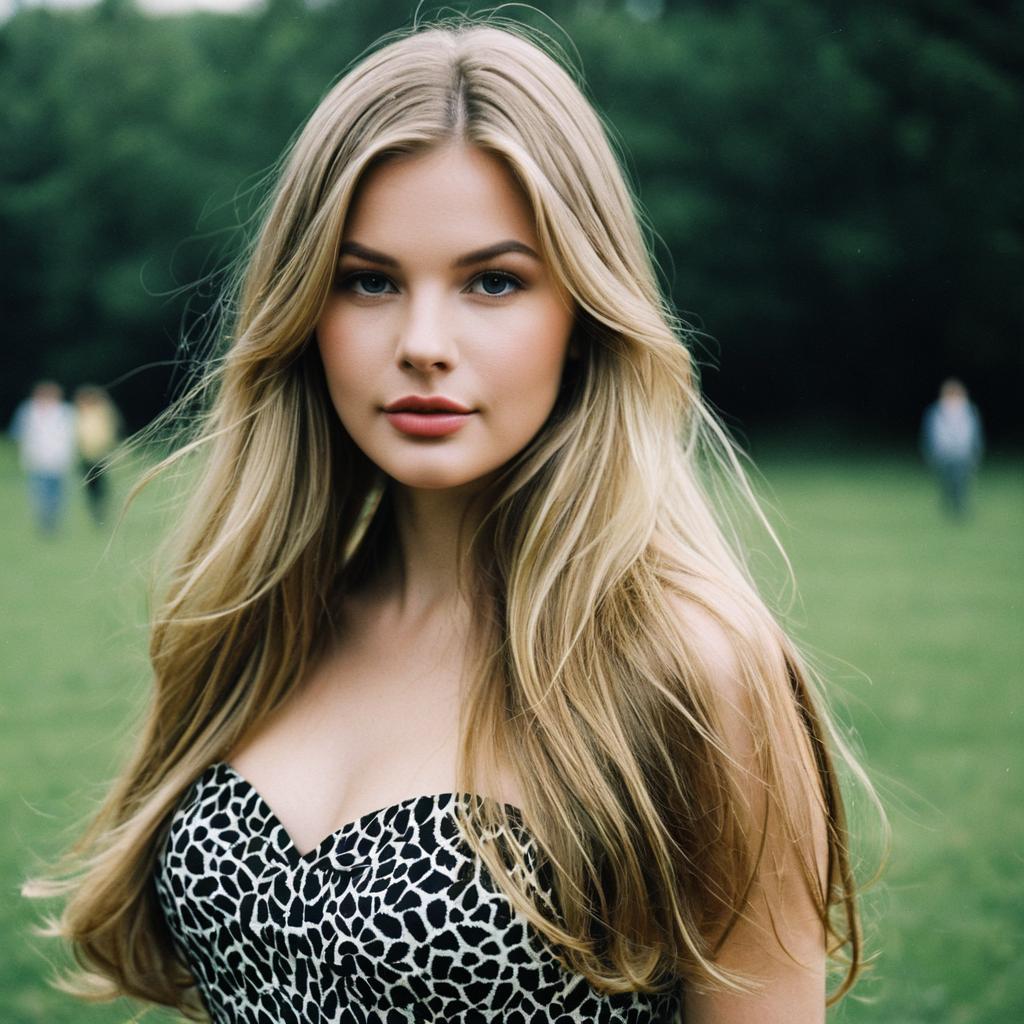 Portrait of a young blonde Caucasian woman with long hair wearing a pink dress. She is standing against a solid pink background, looking directly at the viewer with brown eyes and natural makeup. The image has a realistic style and highlights feminine beauty.