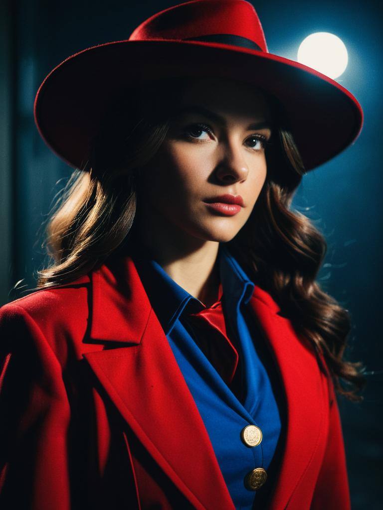 Photorealistic portrait of a woman dressed in a Carmen Sandiego cosplay costume. She wears a wide-brimmed red hat, a red coat with gold buttons and shoulder epaulets, a blue shirt with gold buttons, black gloves, and a black belt with a gold buckle. The image features cinematic lighting and a blurred urban alley background.