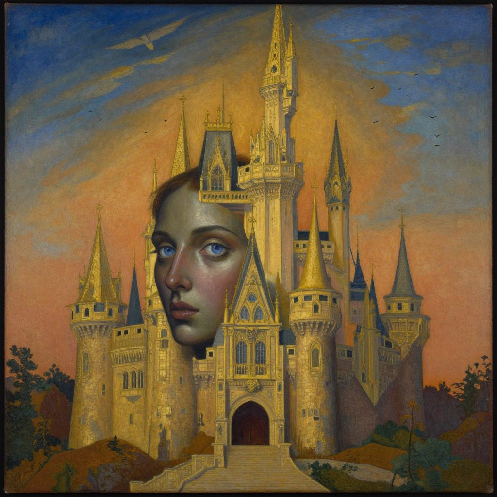 This digital art piece features a surreal blend of fantasy and realism. A detailed, golden castle with multiple spires and intricate architecture stands in the background, bathed in a warm, sunset-like sky with hues of orange, pink, and blue. In the foreground, a realistic, close-up portrait of a woman's face with striking blue eyes and fair skin is superimposed over the castle. The woman's face is centered, with her expression calm and slightly melancholic. The textures of the castle contrast with the smooth, realistic texture of the woman's face, creating a striking visual effect. Small birds are visible in the sky, and dark trees frame the bottom of the image.