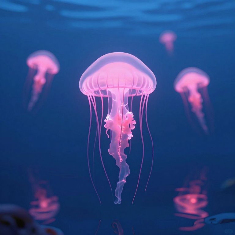 Photograph of glowing jellyfish in deep blue underwater light. The central jellyfish is prominently illuminated with pink and purple hues, featuring a translucent dome-shaped bell and delicate, flowing tentacles. Three more jellyfish are blurred in the background, adding depth. The dark blue water creates a serene, ethereal atmosphere, with subtle reflections of the jellyfish on the ocean floor. The image captures the delicate, bioluminescent beauty of the jellyfish in their natural habitat.