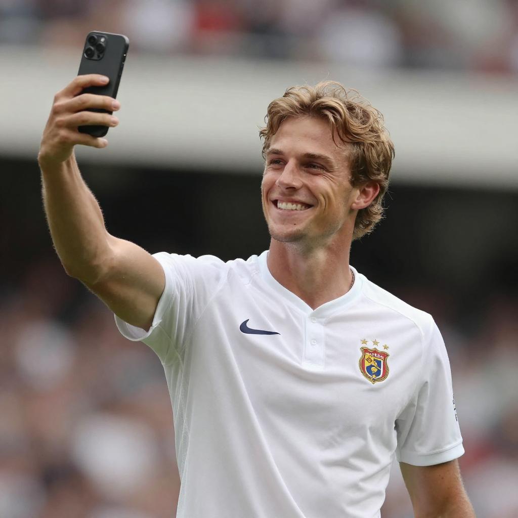Photograph of smiling male soccer player with light brown hair, taking a selfie with a black smartphone in a white jersey.