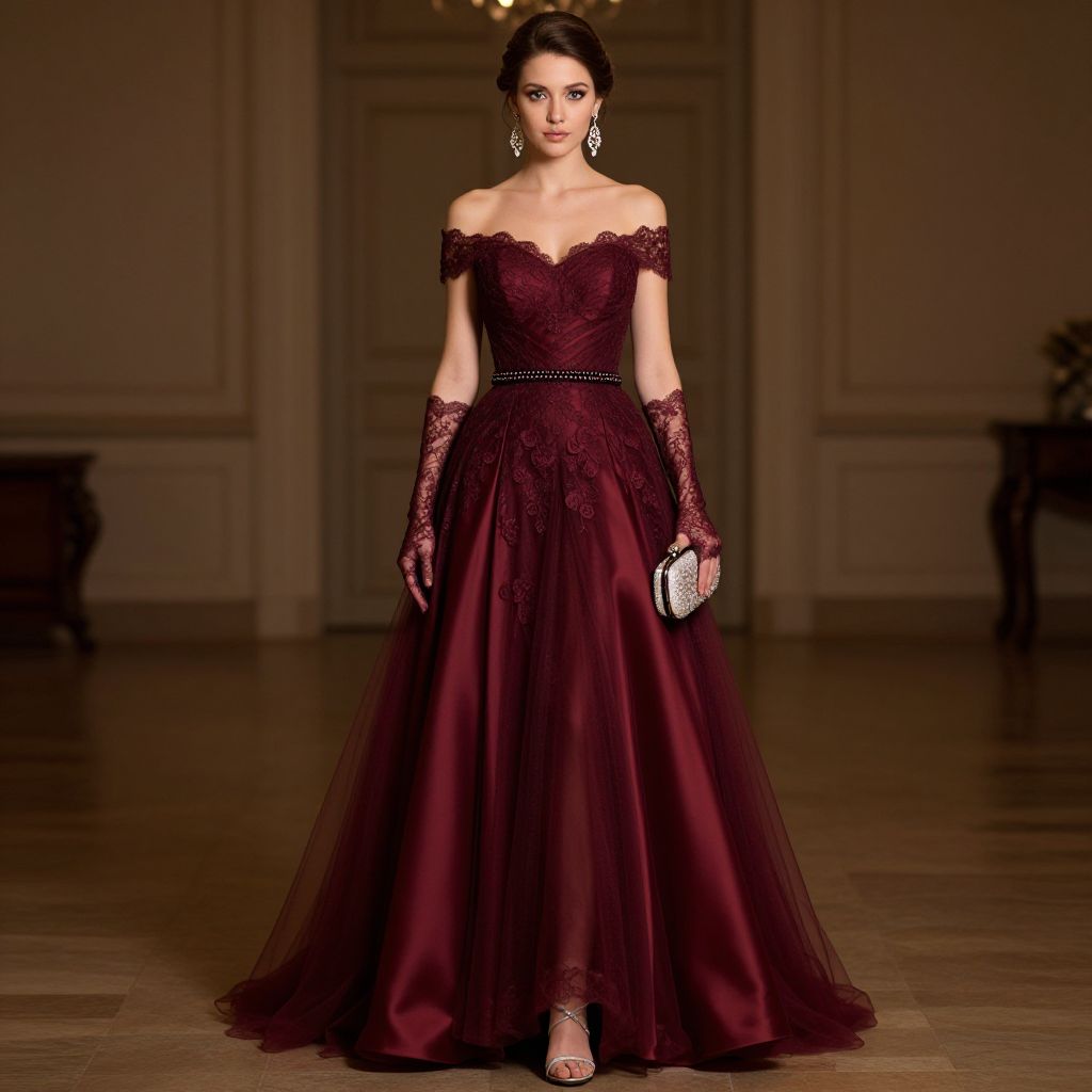 Photograph of a woman in an off-the-shoulder, deep burgundy ball gown with lace gloves, holding a white clutch, walking on a