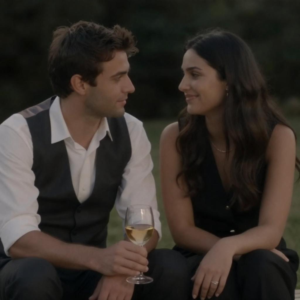 Photograph of three people sitting closely together at night. A man with short dark hair in a black shirt sits on the right, a woman with long brown hair in beige pants sits in the middle, and another man with short dark hair in a black shirt sits behind her, his arm around her shoulders. Dark, blurred trees form the background.