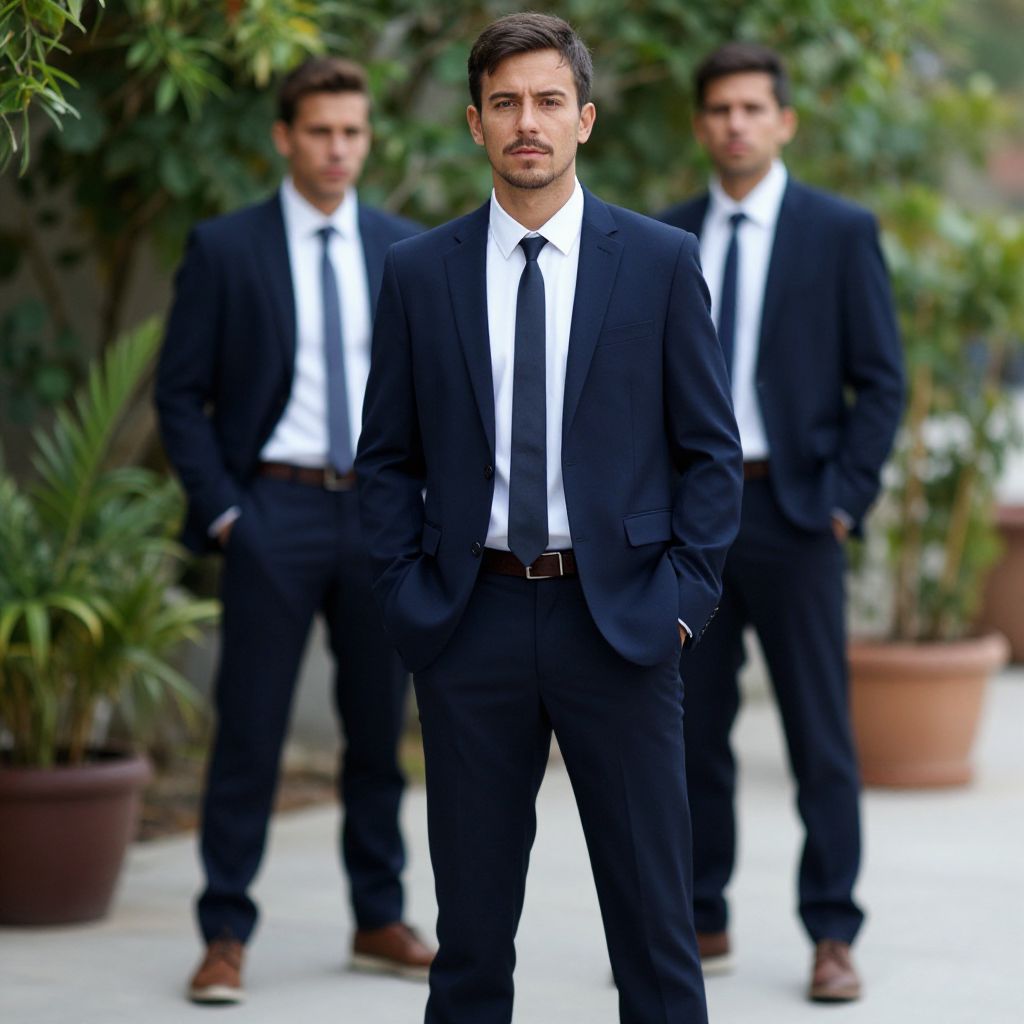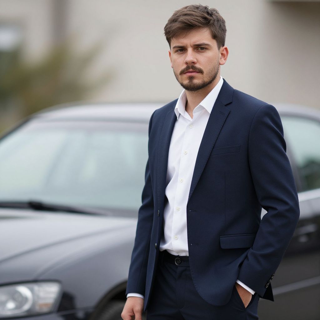 Photograph of a young Caucasian man with short, dark brown hair and a trimmed beard, standing outdoors. He is wearing a dark navy blue suit with a white dress shirt, slightly unbuttoned at the collar. His right hand is in his suit pocket, and he has a serious expression on his face. In the background, there is a blurred black car with a modern design, and a slightly out-of-focus building with neutral-colored walls. The overall setting suggests an urban environment. The man's suit is well-fitted, and the lighting is natural, highlighting his clean, polished appearance.