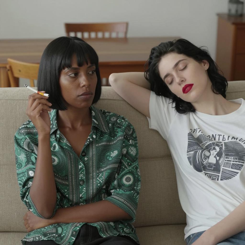 Two young women in a dimly lit room. The brunette on the left has shoulder-length hair, wears a black lace tank top, smokes a cigarette, and looks to the side. The blonde on the right has long hair, wears a brown jacket over a black top, holds a cigarette, and gazes forward with a serious expression. Both women are seated closely together. Background includes a blurred person in the back and a white container on the left.